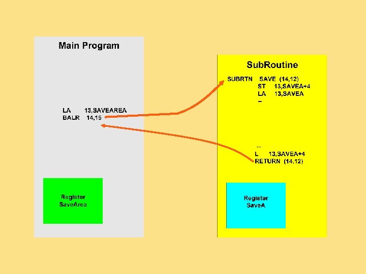 Subroutines • Program within a program • Internal or External – Internal: Assembled with the Main Program – External: Assembled separately from the Main Program – introduces some interesting communication problems • Requires Housekeeping – All routines must provide a Register Save Area – All routines should adhere to linkage conventions
