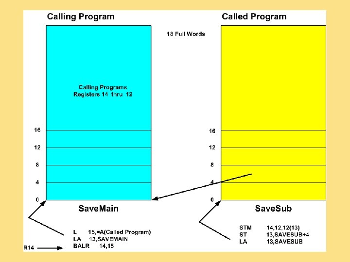 SAVE • • A standard Macro Instruction Generates multiple Assembler instructions If used, it follows START (or CSECT) Almost always coded as: SAVE (14, 12)