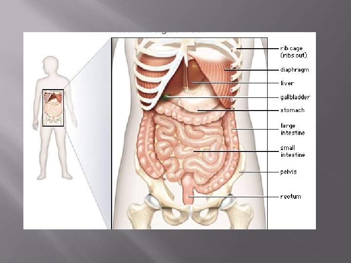 Body Cavities: The Anterior 2. Abdominal Cavity = divided into quadrants… Upper part contains the stomach, small intestines, most of the large intestines, liver, gallbladder, pancreas and spleen 3. Pelvic Cavity = lower abdominal cavity containing urinary bladder, the reproductive organs, and last part of the large intestines