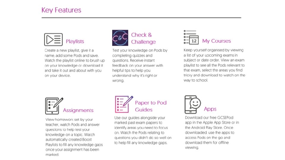 What are students saying about it? GCSEPod has allowed me to multitask while learning, in addition to the method of presentation itself which actually brought information on a silver platter. GCSEPod is, by far, flawless. Student