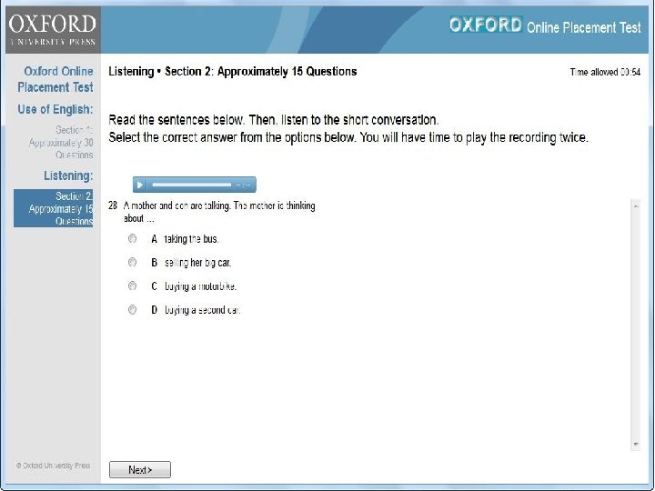 The Oxford Online Placement Test • short: 40 to 45 minutes • comprehensive: Max 45 questions: – 30 Use of English, 15 Listening • reliable: test identifies and adapts to student’s level • clear: automatic marking and instant result • flexible: anywhere with a computer and internet access • informative: results can be broken down and analysed