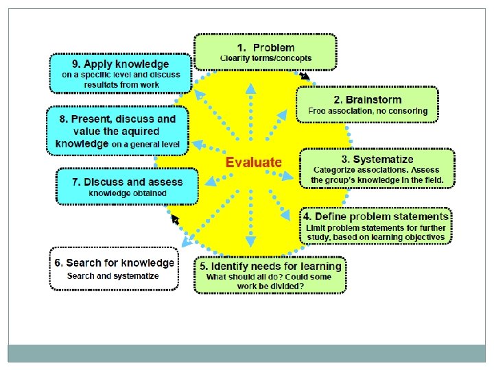 The Seven Step Model (Wood, 2003) Step 1 Identify and clarify unfamiliar terms presented in the scenario, (allocate a scribe and a chairperson, define rules) Step 2 Define the problem or problems to be discussed; Step 3 Ideas storming session to discuss the problem(s), Step 4 Review steps 2 and 3 and arrange explanations into tentative solutions; Step 5 Formulate learning objectives; Step 6 Private study (all students gather information related to each learning objective) Step 7 Reconvene - Group shares results of private study