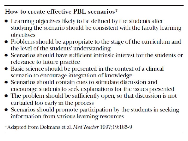 Problems with PBL? Staff/student ratio- an ideal group is 6 -8 students. Faculty busy with traditional curriculum Quality control on triggers (scenarios) is difficult Heavy on library, computer and support resources Inherent conflict with traditional lectures