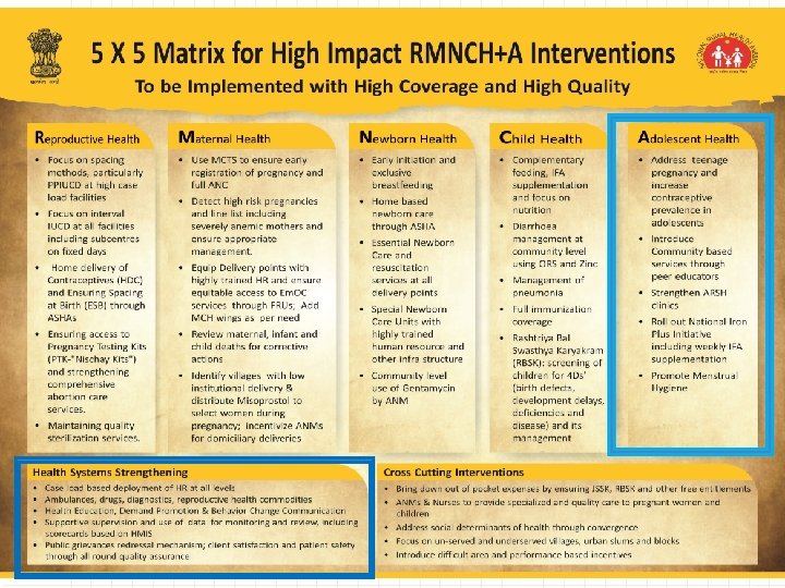 Strategies • Convergence – Within Health & Family Welfare - FP, MH (incl VHND), RBSK, NACP, National Tobacco Control Programme, National Mental Health Programme, NCDs and IEC – With other departments/schemes - WCD (ICDS, KSY, BSY, SABLA), HRD (AEP, MDM), Youth Affairs and Sports (Adolescent Empowerment Scheme, National Service Scheme, NYKS, NPYAD) • Social and Behaviour Change Communication with focus on Inter Personal Communication