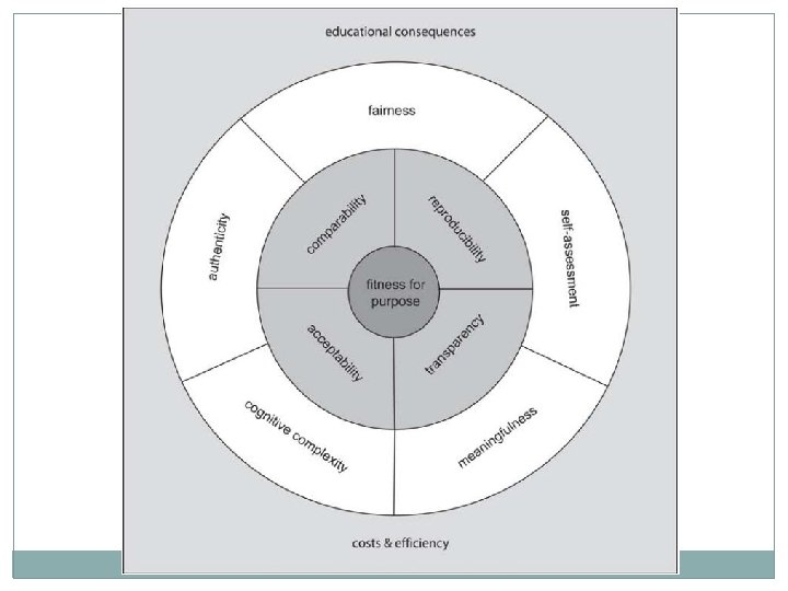 Additional new quality criteria Formative function: Provides good feedback? Students learn something from the test? Does the test have a positive impact on learning? Self / Peer-assessment CAP quality measure: Meaning / Self / Educational implications