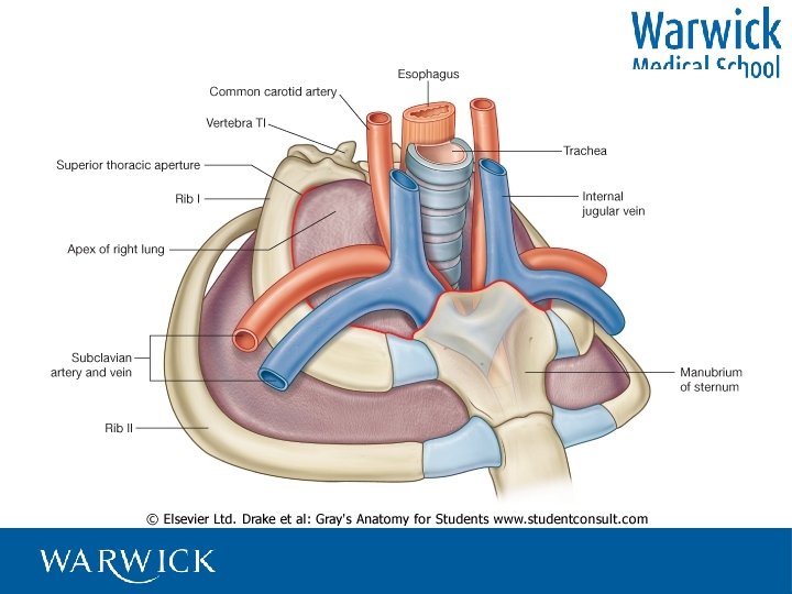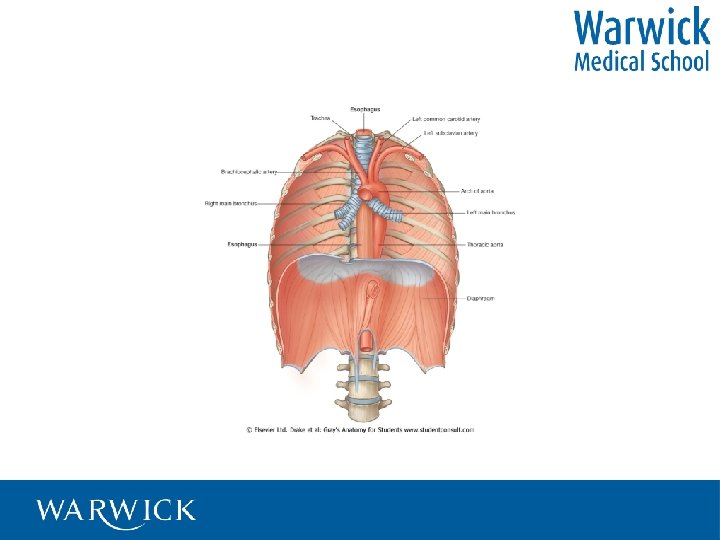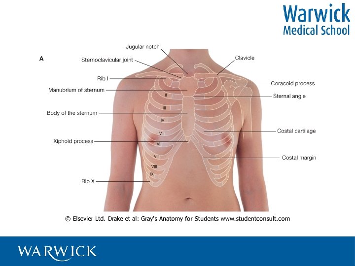 Surface anatomy • Vertebra prominens - C 7 • Sternal notch – overlies trachea • Manubrio sternal angle - T 4/5, bifurcation of trachea, 2 nd costal cartilage, upper order of atria, aortic arch • Xiphoid process – T 9