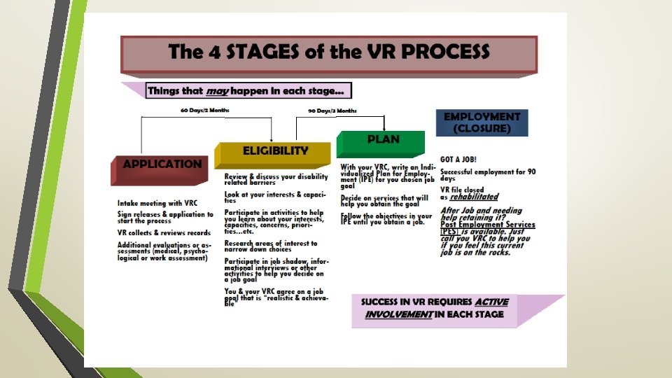 • What to expect when working with VR Confidentiality • Advocacy and compassion • Coordination of services • Professionalism • Accountability • Guidance and insight • Focus on employment • • What is helpful when working with VR Clear Communication Patience • • Case loads Time Frames • Student desire to work • Other service connections in place • Schedule meetings as far in advance as possible. • Keep information updated (address, Phone number)