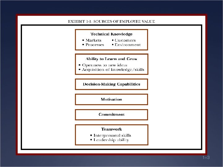 Sources of Employee Value Ü Technical Knowledge Ü Markets, Processes, Customers, Environment Ü Ability to Learn and Grow Ü Openness to new ideas Ü Acquisition of knowledge and skills Ü Decision Making Capabilities Ü Motivation Ü Commitment Ü Teamwork Ü Interpersonal skills, Leadership ability 1– 4