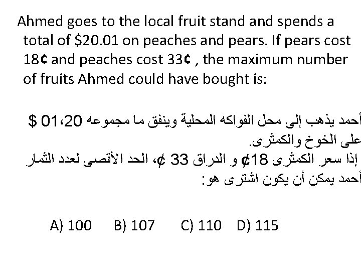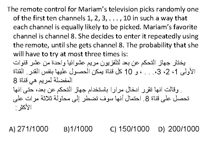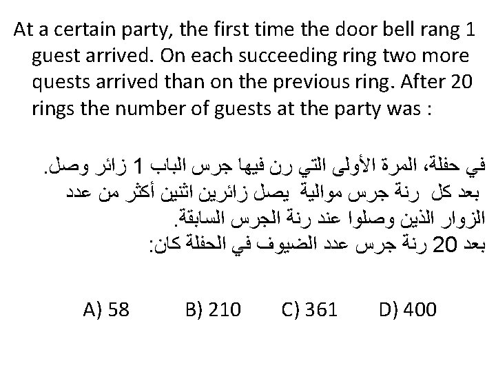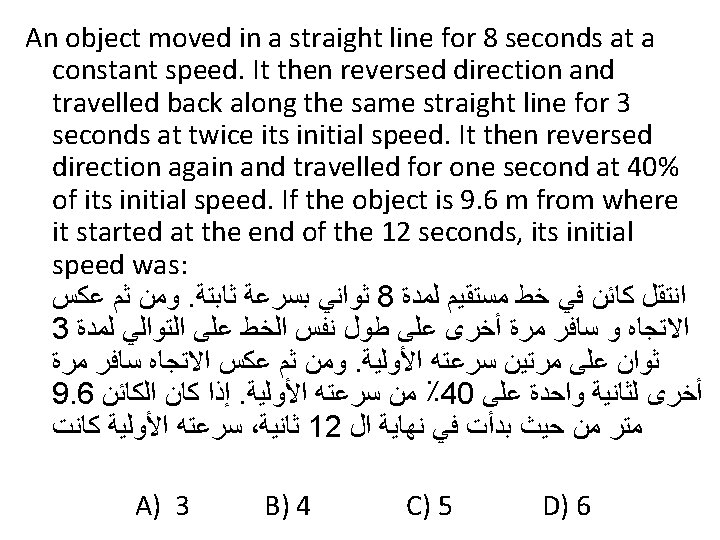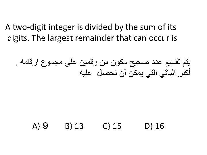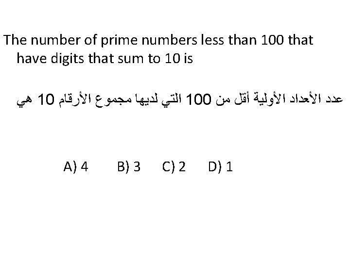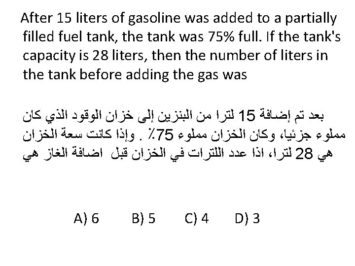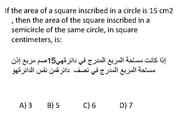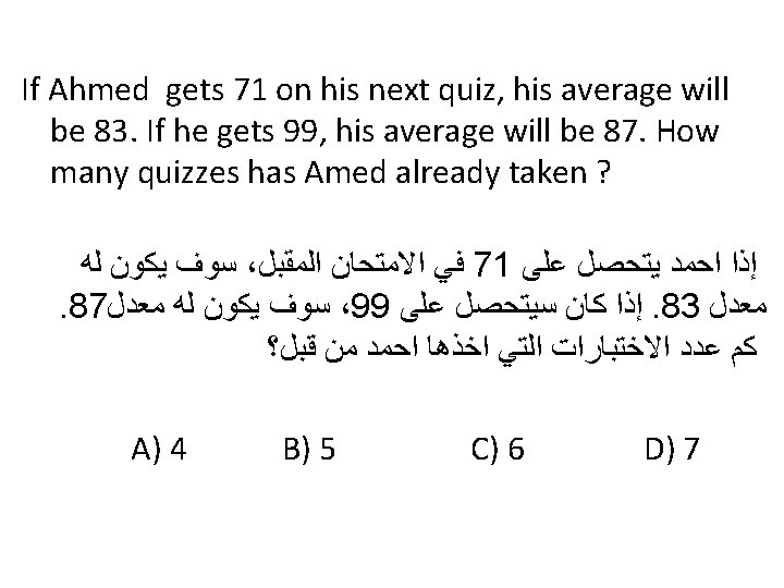 A ten digit code is represented by 4 ABCDEFG 8 H. If the sum of any three successive digits is 19, the value of the digit D is: 4 ABCDEFG 8 H ﻋﺸﺮﺓ ﺃﺮﻗﺎﻡ ﻣﻤﺜﻞ ﺑﺮﻣﺰ ﻣﺎ ﻫﻲ ﻗﻴﻤﺔ ،19 ﺇﺫﺍ ﻛﺎﻥ ﻣﺠﻤﻮﻉ ﺃﻲ ﺛﻼﺛﺔ ﺃﺮﻗﺎﻡ ﻣﺘﺘﺎﻟﻴﺔ ﻫﻮ ﺍﻟﺮﻗﻢ D A) 4 B) 5 C) 6 D) 7