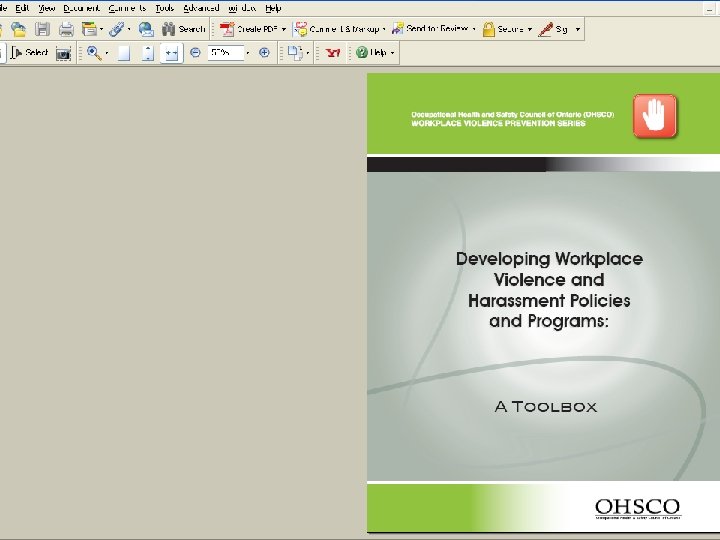 TOOLBOX • • • Workplace violence survey Policy program & training review tool Workplace violence assessments Action plan Sample violence policy Sample harassment policy