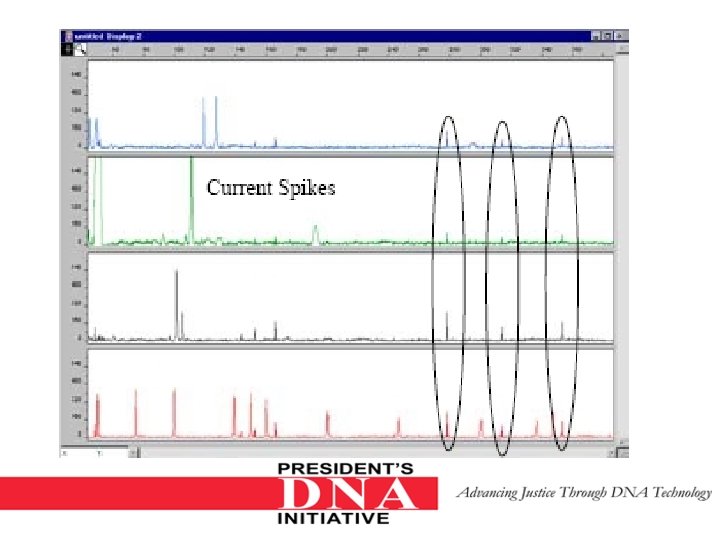 Offscale data ØIf too much sample DNA is added to the PCR reaction mixtures, the fluorescence intensity from the PCR products may exceed the linear dynamic range for detection by the instrument. This is referred to as “off-scale” data. ØMulticomponent analysis cannot be performed accurately on data that is off-scale. Samples with off-scale peaks will exhibit raised baselines and/or excessive “pull-up” of one or more colors under the off-scale peaks. ØAnalyzed data from off-scale peaks should not be used for quantitative comparisons. For example, the stutter peak that corresponds to an off-scale main peak is likely to be overestimated.