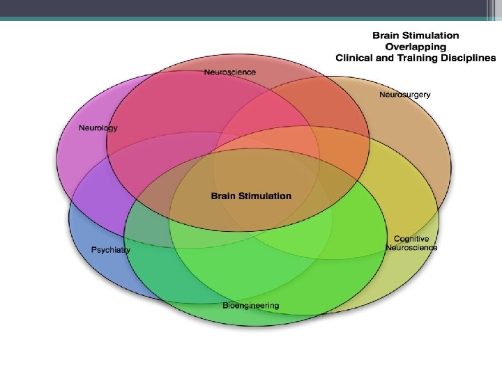 Main Brain Stimulation Techniques • ECT - Electroconvulsive Therapy ▫ FEAST • r. TMS - repeated Transcranial Magnetic Stimulation ▫ Neuronetics, Magstim, Brainsway, Neuralieve, Neostim, Neosync • DBS - Deep Brain Stimulation ▫ RST - Responsive Stimulation Therapy ▫ Epidural Cortical Stimulation • VNS - Vagus Nerve Stimulation • MST - Magnetic Seizure Therapy • t. DCS - transcranial Direct Current Stimulation • TENS - transcutaneous Electrical Nerve Stimulation ▫ Cranial Electrical Stimulation (CES) Alpha-stim • EPI-f. MRI - echoplanar f. MRI • Transcranial pulsed ultrasound