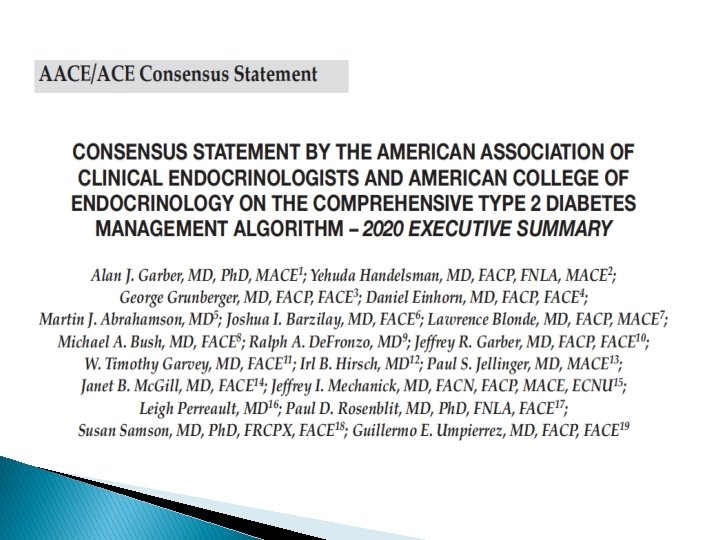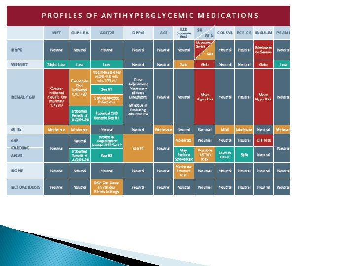 � A less stringent A 1 C >6. 5% is appropriate for patients with a history of severe hypoglycemia, limited life expectancy, advanced renal disease or macrovascular complications, extensive comorbid conditions, or long-standing T 2 D in which the A 1 C goal has been difficult to attain despite intensive efforts � Aim to make the patient remain free of polydipsia, polyuria, polyphagia, or other hyperglycemia-associated � symptoms.