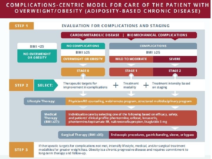 ABCD(adipose tissue based chronic disease) � AACE has advoated ABCD as a better diagnostic term to define obesity as a disease. � Weight loss must be considered in all patients with ABCD, since it improves insulin sensitivity, lowers glycemia, improves lipd profile and BP � Prevents progression of prediabetes to overt DM � Wt loss also prevents NAFLD, OSA and mechanical complications in patients with ABCD � There has been a shift from BMI centric approach to complications centric model in the management of obesity