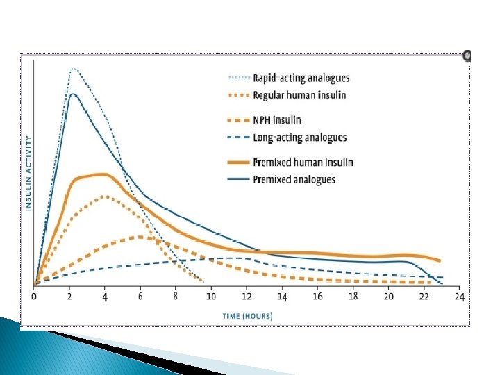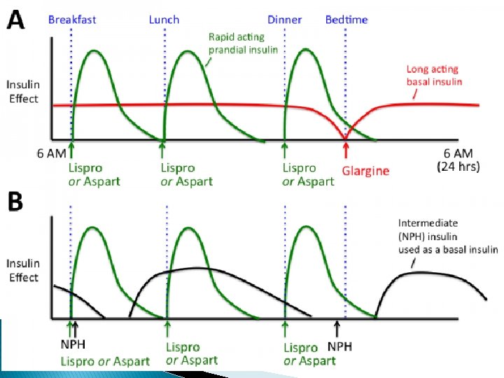 � When insulin becomes necessary a single daily dose of basal insulin analogue should be added to the regimen. � Dose should be adjusted at regular and fairly short intervals(days) � Basal insulin analogues are preferred to NPH because a single basal insulin analogue dose provides a relatively flat serum insulin concentration for 24 hrs or longer. � But basal insulin analogues and NPH have been shown to be equally efficacy In reducing A 1 C In clinical trials.