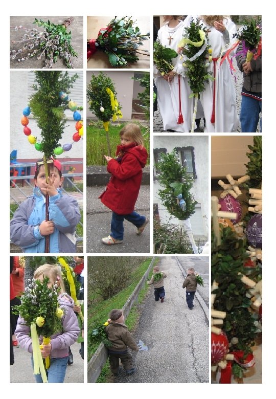Das Palmenbinden ist recht einfach. Manche Gemeinden haben ihre eigenen Traditionen und geben diese gerne an ihre Kinder weiter. Fragen Sie einfach mal nach, wenn Sie das möchten. Ansonsten werden aber eigentlich „nur“ verschiedene grüne Zweige benötigt. Palmkätzchen oder Forsythien sehen auch schön dazu aus. An einem Stecken werden die Zweige mit Gartenbindedraht angewickelt. Soll der Palmwedel dick sein, muss entsprechend viel Grün umgewickelt werden. Es kann auch bis weiter unten angewickelt werden, so dass der Palmwedel länger sich um den Stab windet. Wer möchte, kann ausgeblasene oder bunte Eier anhängen. Bändel oder meist gelb / weißes Krepppapier sind auch ein schönes Bild. Anbei einige einfache Beispiele in Bildern: