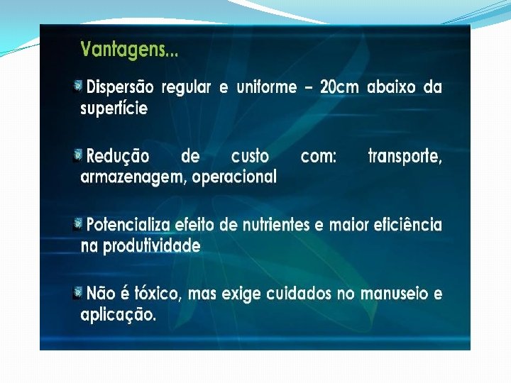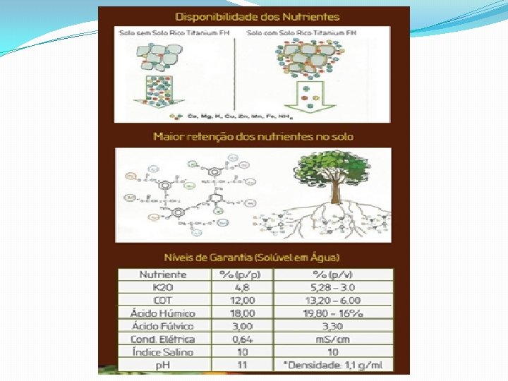 �Revitaliza a fauna microbiológica do solo; �Aumenta os níveis de matéria orgânica; �Ajuda a liberação do P; �Com o tempo diminui até 30% os adubos convencionais; �Aumenta a resistência contra pragas e doenças; �Aumenta as radicélulas que competem com a nematóide;