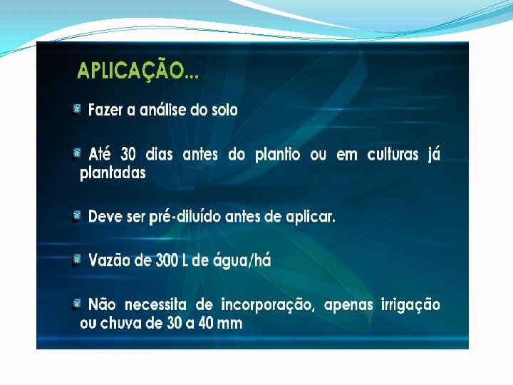 EFEITOS COMPROVADOS POR CLIENTES • • • Anulou a toxidez de alumínio; Elevou o p. H do solo; Auxiliou no processo de mineralização; Promoveu a liberação - N, P, K , Ca , Mg, Mn, B, S; Melhorou o equilíbrio do solo – CTC; Fornecimento de Cálcio e Magnésio para a planta; Melhorou a atividade bacteriana; Diminuiu a fixação de P; Aumentou a saturação por base.