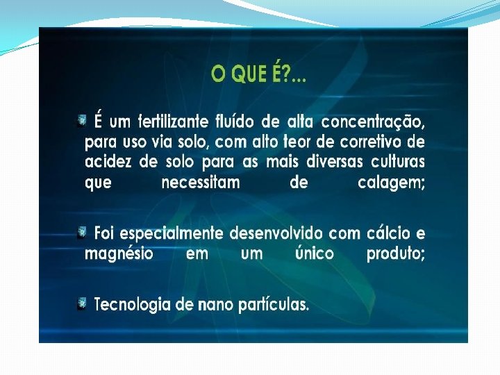 Nanotecnologia • Partículas infinitamente menores que as células das plantas, com isso a facilidade em absorver o produto. • O CALCITEC possui 100% de eficiência na solubilidade e pode ser aplicado em qualquer época do ano desde que tenha chuvas.