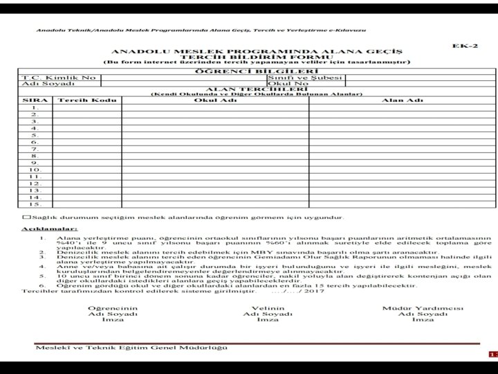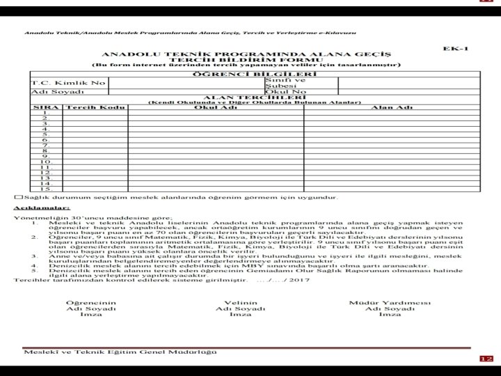 Yerleştirildiği alanı değiştirmek isteyen öğrenciler kontenjan açığı bulunması durumunda koşullarını taşıdıkları alanlara 10. sınıfta birinci dönemin sonuna kadar alan değiştirerek de geçiş yapabilirler. ATP ve AMP yerleştirme sonuçları Haziran ayı içerisinde açıklanacaktır. Mesleki ve Teknik ortaöğretim kurumlarında uygulanmakta olan meslek alanlarının OKUL, PROGRAM, ALAN VE DAL TANITIM BİLGİLERİ http: //mtegm. meb. gov. tr ile http: //megep. meb. gov. tr adreslerinde yer almaktadır.