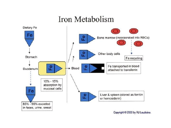 Causes Iron Deficiency • Blood loss – Menstruation – GI loss – Other chronic blood loss • Dietary • Pregnancy • Coeliac disease • Partial/total gastrectomy • Atrophic Gastritis • Regular blood donation • Hookworm infection-biggest worldwide cause