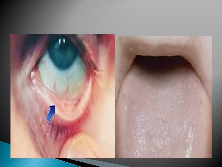 Clinical features: Symptoms -May be no symptoms especially mild anemia -In moderate anaemia patient may complain of : feeling of weakness, exhaustion, lassitude, indigestion, loss of appetite, palpitation , dyspnea, edema and rarely anasarca, even congestive cardiac failure in severe cases Signs: -No sign in mild anemia -Pallor glossitis, stomatitis -Edema due to hypoproteinemia , soft systolic murmer at mitral area, fine crepitation at base of lung due to congestion