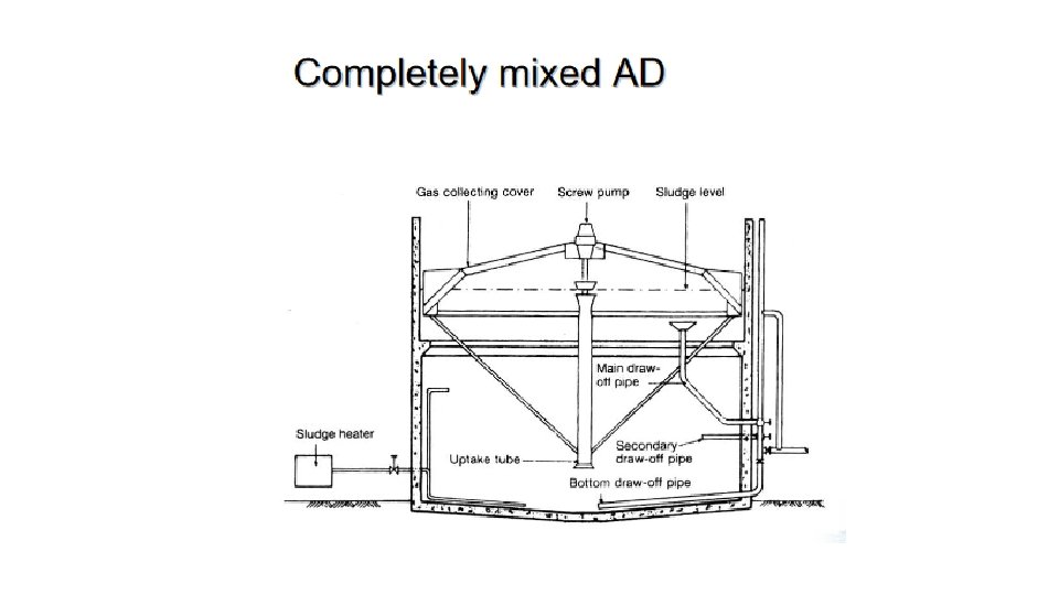 Completely Mixed AD Completely mixed reactor with no solids recycle in which the SRT equals the HRT. Wastewater and anaerobic bacteria are mixed together and allowed to react. When the organic pollutant is reduced to desired level, treated wastewater is then removed. Can be operated in either batch or continuous mode and depends on the continuous growth of new biomass to replace that lost in effluent.