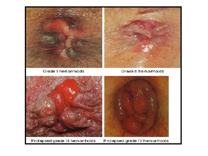 • Pain? -> painless • Bright red bleeding • Prolapse associated with defecation Internal External • Anoderm • Swell, discomfort, difficult hygiene • Pain? -> Thrombosed