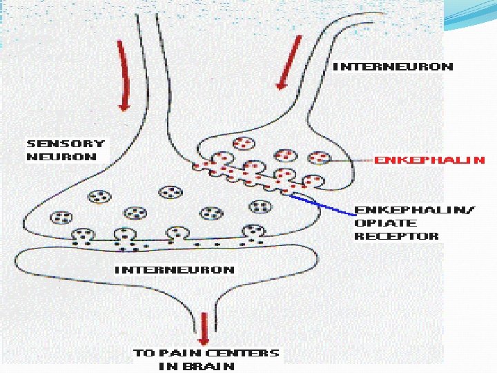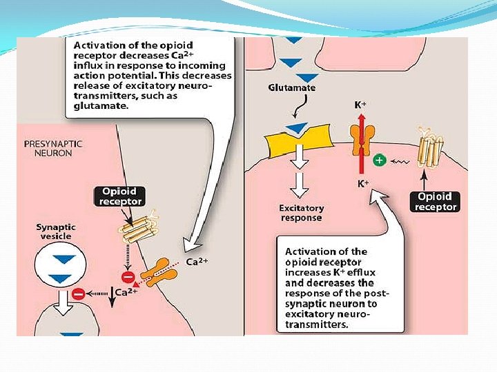 OPIOID RECEPTORS Presynaptically: Opioid receptor activation can close voltage – gated calcium ion channels to inhibit neurotransmitter release (serotonin, glutamate and substance P)