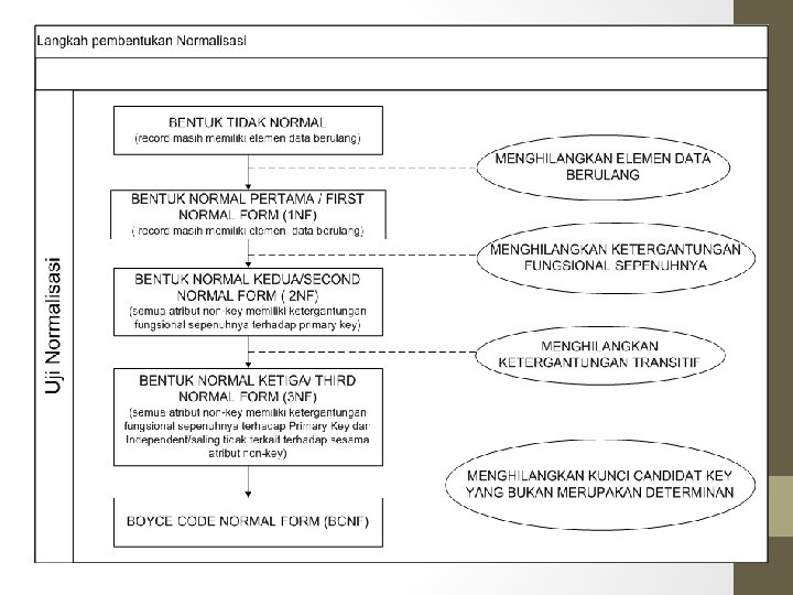 Normalisasi • Normalisasi adalah suatu proses memperbaiki / membangun dengan model data relasional dan secara umum lebih tepat dikoneksikan dengan model data logika • Normalisasi adalah proses pengelompokkan data kedalam bentuk tabel/relasi untuk menyatakan entitas dan hubungan mereka sehingga terwujud satu bentuk database yang mudah untuk dimodifikasi • Normalisasi adalah proses untuk mengidentifikasi “tabel” kelompok atribut yang memiliki ketergantungan yang sangat tinggi antara satu atribut dengan atribut lainnya