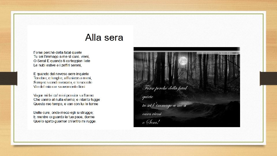 Parafrasi: Forse per il fatto che della morte tu sei l'immagine, il tuo arrivare mi è così caro, oh sera! Sia quando ti accompagnano le nuvole estive e i venti sereni, sia quando porti con te dal cielo nevoso tenebre lunghe e inquietanti, tu, sera, sei sempre da me attesa, e le segrete vie del mio cuore occupi poi con dolcezza. Tu o sera mi fai vagabondare con la mente lungo le orme del pensiero che portano fino alla morte; e intanto passa il triste tempo che sto vivendo e con lui se ne vanno le preoccupazioni per colpa delle quali il tempo si consuma con me; e mentre io osservo la tua pace, dorme lo spirito ribelle che dentro di me si agita.