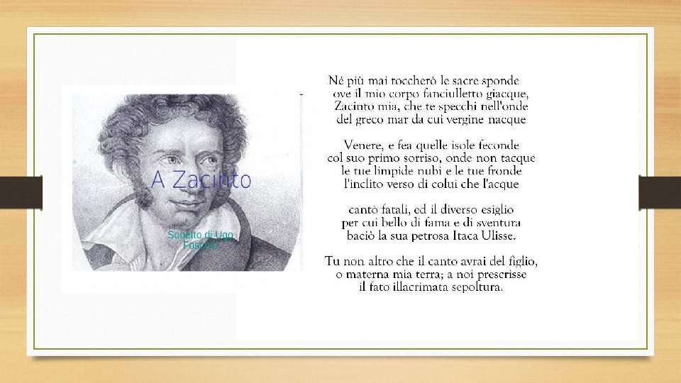 Livello tematico. Il sonetto (componimento di 14 versi endecasillabi, divisi in due quartine e due terzine, con rima alternata o incrociata) è dedicato a Zacinto o Zante, una delle isole Ionie, in quel momento sotto il dominio della Repubblica di Venezia, dove Foscolo è nato. Il tema è quello dell’esilio del poeta e del suo definitivo distacco dalla patria. Una nostalgia e un dolore ancora più forti perché sa che non potrà più fare ritorno nella sua terra. Il testo può essere diviso in diversi nuclei tematici: