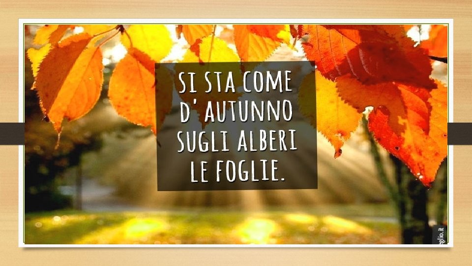 Livello metrico Quattro versi liberi: unendo i versi 1 -2 e 3 -4 si ottengono due perfetti settenari. L’assenza della punteggiatura, come in molte altre liriche di Ungaretti, accentua la capacità espressiva delle parole e ciò lo aiuta a dare l’idea di un flusso continuo, quasi come se il tempo si fosse fermato per quelle foglie e quei soldati negli istanti che precedono la fine. A livello denotativo i soldati sono come le foglie che, nel periodo autunnale, cadono dagli alberi A livello connotativo la poesia, scritta in tempo di guerra, vuole esprimere l'incertezza e la precarietà della vita dei soldati al fronte, che possono morire da un momento all'altro, come le foglie, in autunno, possono staccarsi improvvisamente dai rami.