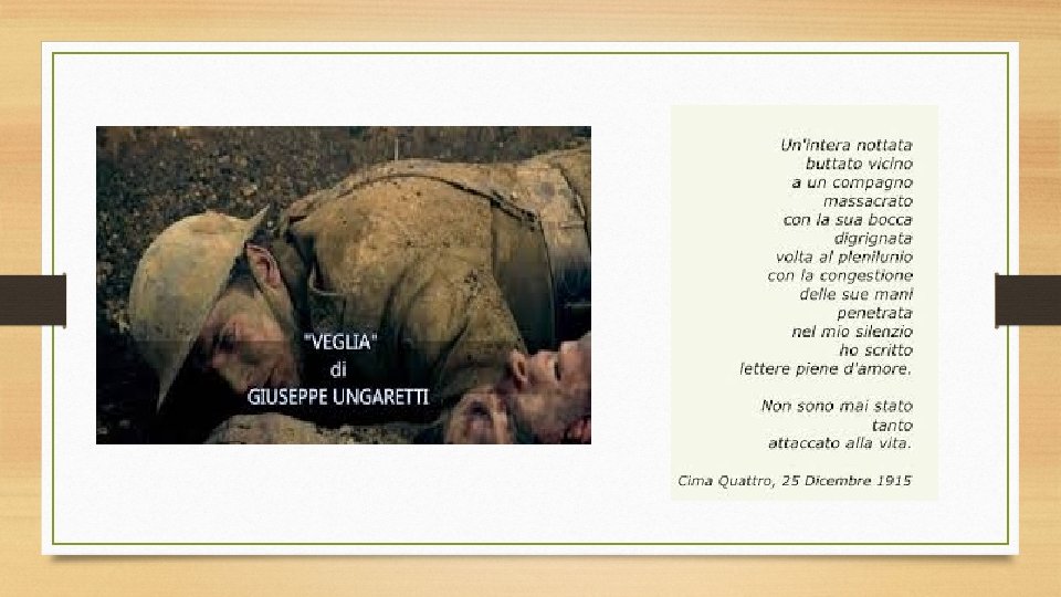 Veglia viene composta da Ungaretti il 23 dicembre 1915 ed entra a far parte della sezione Il Porto Sepolto dell’opera L’Allegria. Il componimento reca testimonianza della difficile esperienza del primo conflitto mondiale, combattuto tra il 1914 e il 1918. La poesia è composta di due strofe, la prima di 13 versi e la seconda di 3 versi. Si tratta di versi liberi dove un io, quello del poeta, è chiamato a confrontarsi in maniera diretta con la morte del compagno. Un’immagine forte rimarcata dall’ossessiva scansione ritmica conferita dalla ripetizione della doppia “t”, che ci trasporta verso il fulcro retorico dell’intero componimento e trasmette tutta la violenza e l’angoscia della situazione vissuta dal poeta. Ma quest’esperienza angosciante sfocia in un contrario pensiero vitale, all’attaccamento alla vita che solo il dolore più estremo, come la visione d’un morto ucciso nella realtà di guerra, può suscitare.