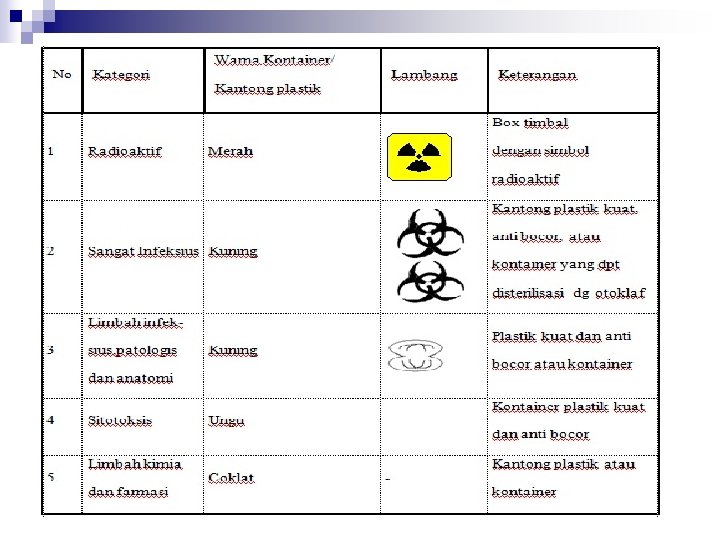 REKOMENDASI KODE WARNA UNTUK LIMBAH LAYANAN KESEHATAN Jenis limbah Warna kontainer dan penandaan Jenis kontainer Limbah sangat infeksius Kuning, bertanda”SANGAT INFEKSIUS” Kantong plastik anti bocor yang kuat atau kontainer yang dapat di autoclaving Kantong plastik atau kontainer anti bocor. Kontainer anti robek Limbah infeksius lain, limbah patologis dan anatomis. Kuning Benda tajam Kuning, bertanda “BENDA TAJAM” Limbah bahan kimia dan sediaan Cokelat farmasi Limbah radioaktif - Limbah layanan kesehatan umum Hitam Kantong plastik atau kontainer Kotak timah, diberi label dengan simbol radioaktif Kantong plastik