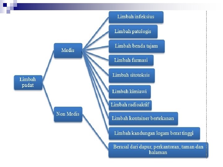 JENIS LIMBAH RUMAH SAKIT Limbah yang dihasilkan dari rumah sakit dapat dibagi menjadi dua : 1. Limbah medis - Padat - Cair - Radioaktif 2. Limbah nonmedis - Padat - Cair