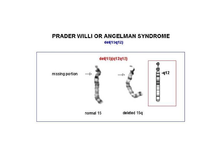 Angelman • 70% dei casi delezione della regione cromosomica 15 q 11 -q 13, che è soggetta al fenomeno dell'imprinting del cromosoma paterno • Il gene materno (l'unico espresso) può essere alterato con 4 meccanismi noti: – – delezione disomia uniparentale paterna difetti nell'imprinting mutazioni a carico del gene UBE 3 A (ubiquitin ligasi) • La diagnosi è clinica e il difetto genetico non si identifica nel 20% dei casi