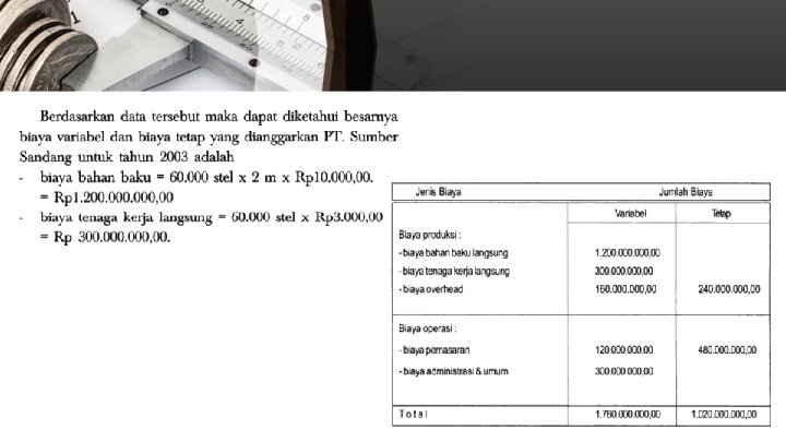 BIAYA SEMIVARIABEL • • Pengaturan minimum mungkin diperlukan, atau kuantitas minimum dari perlengkapan atau jasa mungkin perlu digunakan untuk memelihara kesiapan beroperasi. Klasifikasi akuntansi, baik berdasarkan objek pengeluaran maupun fungsi umumnya mengelompokkan biaya tetap dan biaya variabel bersama-sama. Misalnya saja, biaya mesin uap yang digunakan untuk memanaskan ruangan yang bergantung pada kondisi cuaca dan biaya mesin uap yang digunakan untuk proses produksi yang bergantung pada volume produksi, mungkin dibebankan ke akun yang sama sehingga mengakibatkan tercampurnya biaya tetap dan biaya variabel dalam akun yang sama. Contoh : gaji dan bonus penjualan untuk bagian marketing. Total biaya = biaya tetap + total biaya variable