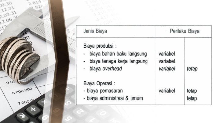 BERDASARKAN VOLUME • Biaya tetap ( Fixed Cost) adalah biaya yang jumlahnya sampai tingkat kegiatan tertentu relatif tetap dan tidak terpengaruh oleh perubahan volume kegiatan. • Biaya variabel (Variable Cost) adalah biaya yang jumlahnya berubah-ubah sebanding dengan perubahan volume kegiatan, namun biaya per unitnya tetap. • Biaya semi variabel (Semi Variable) adalah biaya yang sebagian tetap dan sebagian lagi berubah sebanding dengan perubahan volume kegiatan.