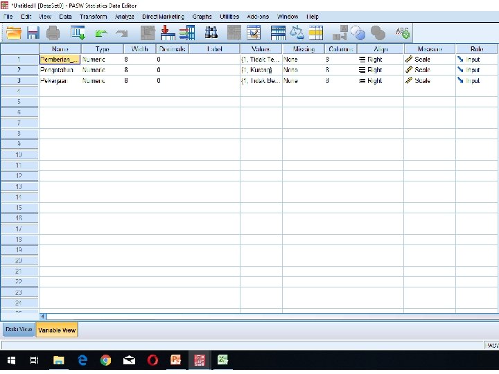 1. Buku program SPSS. 2. Klik variable view pada SPSS, kemudian pada kolom name ketik variabel yang akan dilakukan pengujian, misalnya perilaku dan daerah, ketik di kolom label dan kolom value sesuai dengan keterangan hasil di atas, lihat gambar.