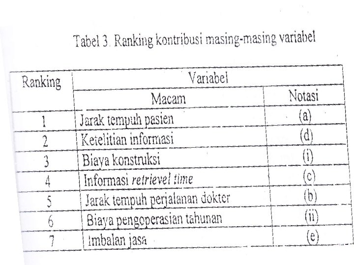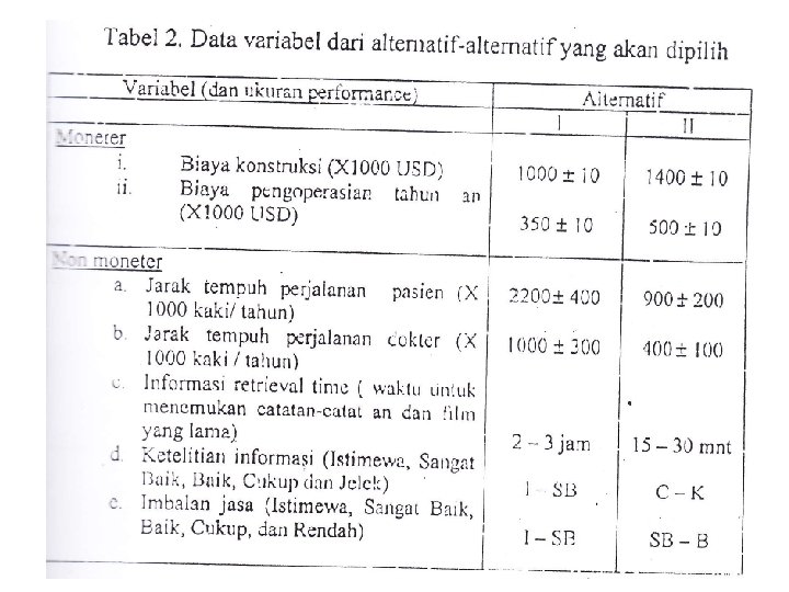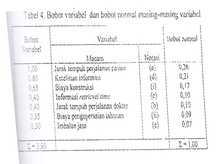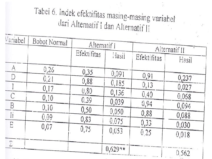 PERTIMBANGAN DALAM PENGAMBILAN KEPUTUSAN • Variabel diurutkan berdasar ranking kontribusi dari tertinggi ke terendah • Masing-2 variabel ditentukan bobotnya, shg kepentingan relatifnya dikuantifikasikan antara 0 – sampai 1 • Dibuat skala performance (efektifitas) dari masing-2 alternatif dalam mendapatkan nilai maksimum yang dapat diperoleh masing-2 variabel. • Bobot normal (butir 3) dikalikan dengan bobot masing-2 variabel (pada butir 2), kemudian di jumlahkan semua variabel untuk masing-2 alternatif, maka diperoleh skor yg menunjukkan nilai total dari suatu alternatif.
