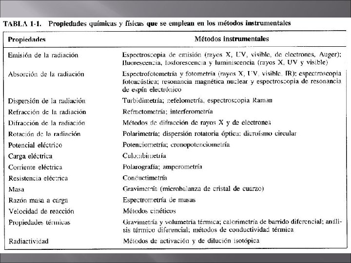 Métodos Clásicos Separación de los componentes de interés de una muestra (analitos) mediante: Precipitación Extracción Destilación Análisis Cualitativos Los componentes separados se trataban con reactivos dando origen a productos que se podían identificar por su color, punto de ebullición o de fusión, su solubilidad, su olor, su actividad óptica o su índice de refracción. Análisis Cuantitativos La cantidad de analito se determinaba mediante medidas gravimétricas o volumétricas.