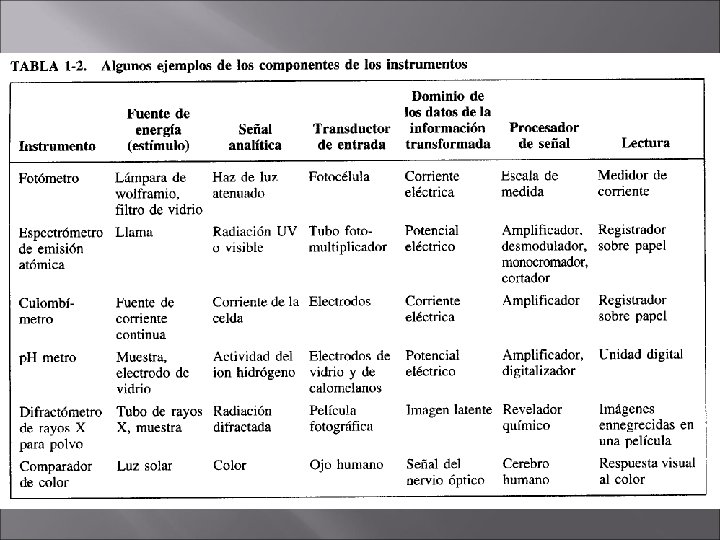 Componentes de un Instrumento – Generador de señales – Transductor de entrada o detector – Procesador de señales – Transductor de salida o dispositivo de lectura