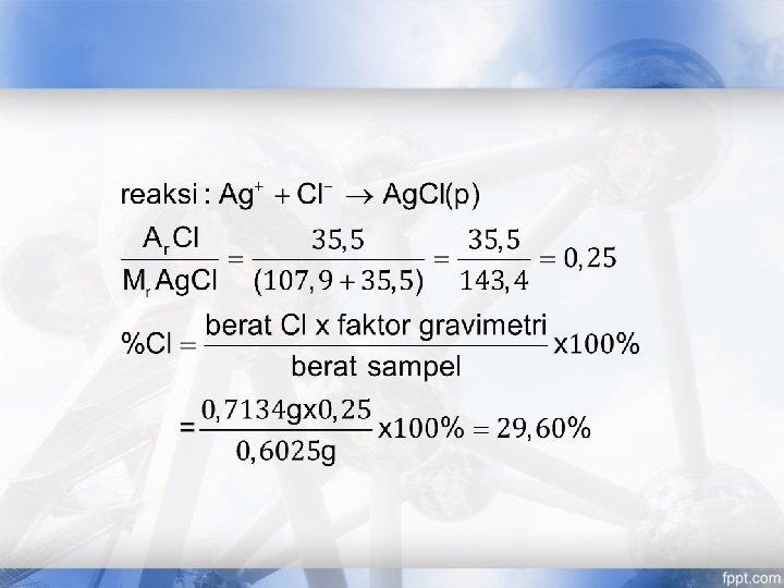 Contoh soal 1: • 0, 6025 gram sampel garam klorida dilarutkan dalam air dan kloridanya diendapkan dengan menambahkan perak nitrat berlebih. Endapan perak klorida disaring, dicuci, dikeringkan ditimbang. Ternyata beratnya 0, 7134 gram. Hitunglah persentase klorida dalam sampel. (Ar Cl=35, 5 ; Ar Ag=108)