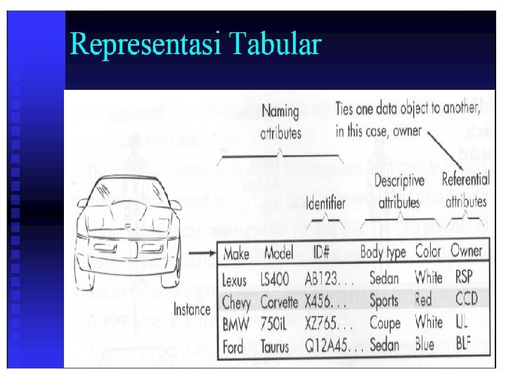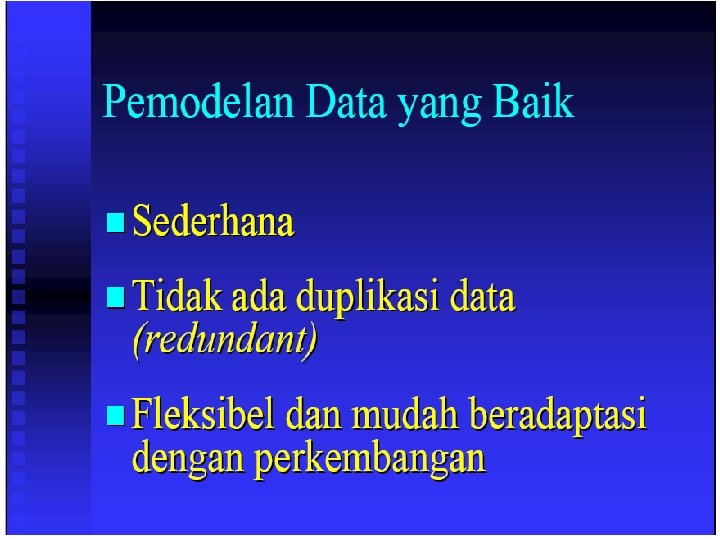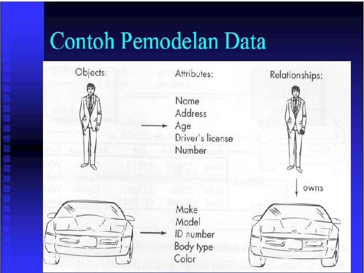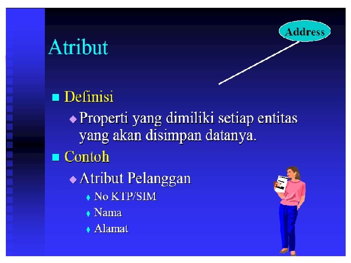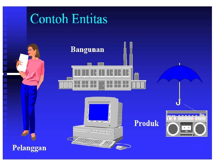 Entitas n Definisi n n Sebuah obyek yang dapat dibedakan dari obyek lain Contoh n n n Individu : pegawai, pelanggan, mahasiswa, distributor Tempat : kampus, kantor, lapangan Obyek : buku, motor, paket software Peristiwa : pendaftaran, pemesanan, penagihan Konsep : rekening, kualifikasi