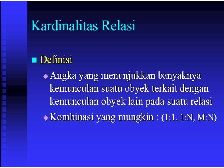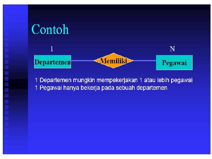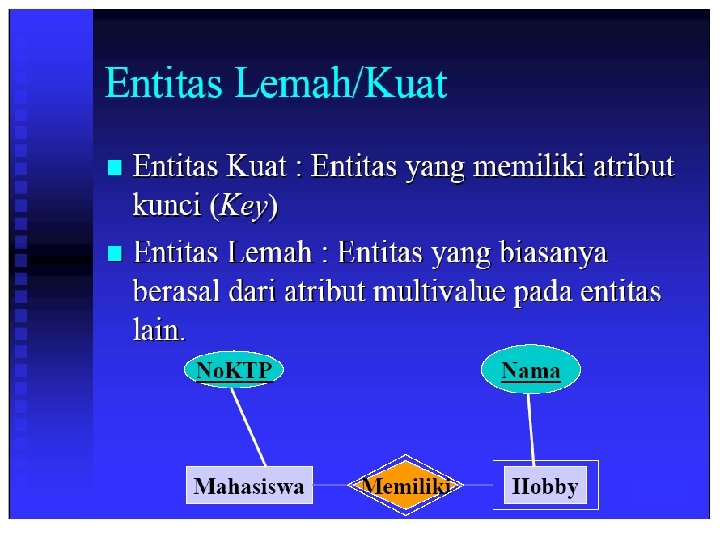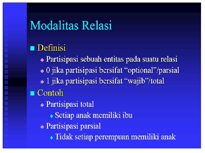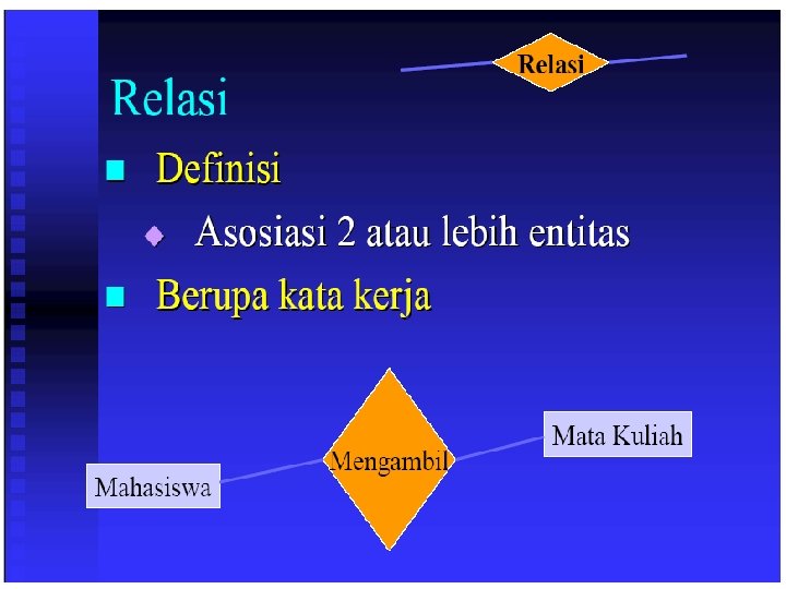 Komponen ERD n n n Entitas (entity) Relasi (relationship) Atribut (attribute) Kardinalitas (kardinality) Modalitas (modality)