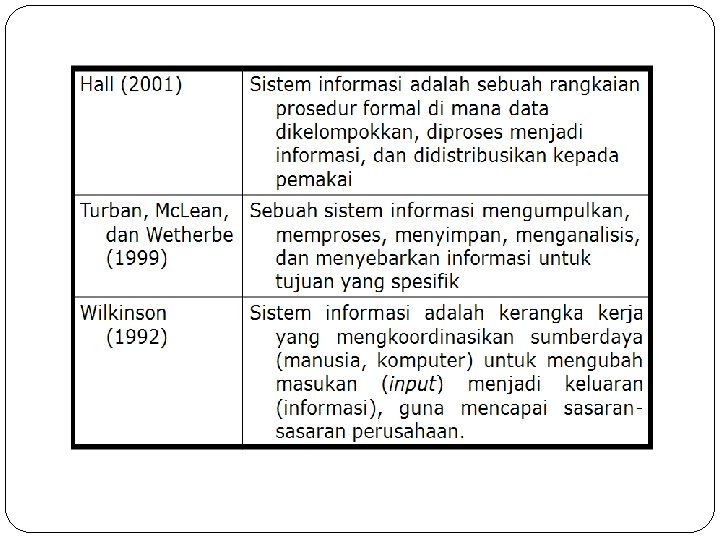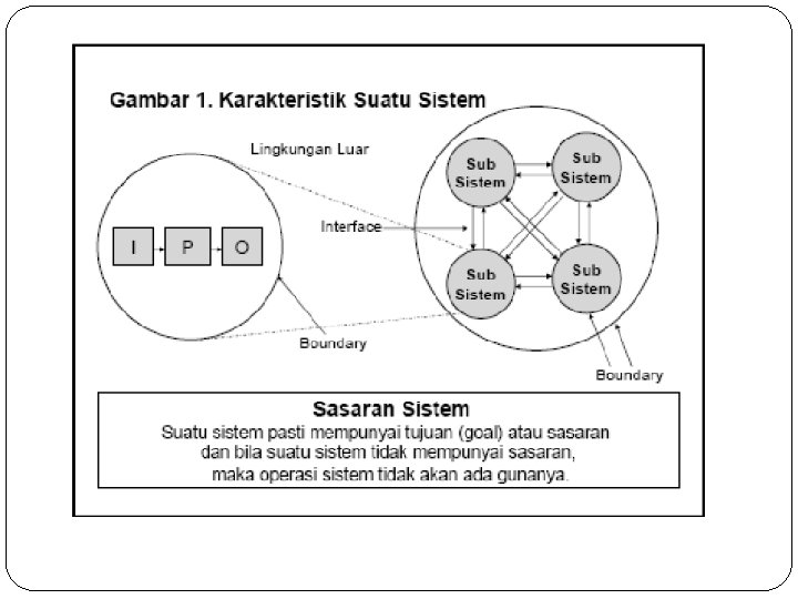 ● Menurut Gordon B. Davis (1984) “Sebuah sistem terdiri dari bagian-bagian yang saling berkaitan yang beroperasi bersama untuk mencapai beberapa sasaran atau maksud. “ Menurut Scott (1996) Sistem terdiri dari unsur-unsur seperti masukkan (input), pengolahan (processing), serta keluaran (output).