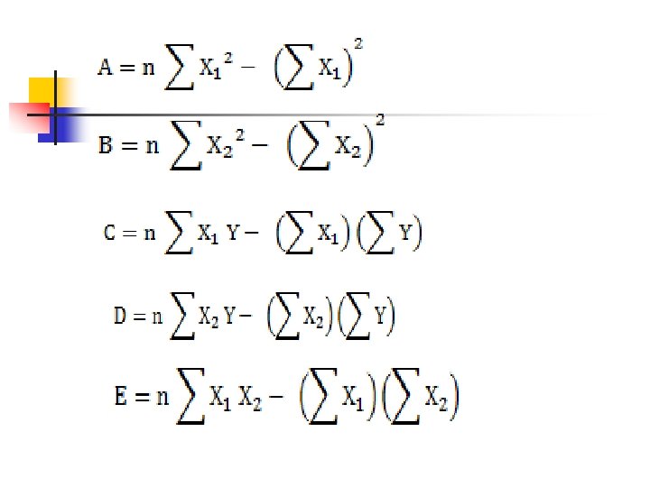CONTOH PENERAPAN REGRESI BERGANDA Pengaruh harga dan pendapatan terhadap permintaan minyak goreng. ∑Y ∑X 1 ∑Y 2 ∑X 1 Y ∑X 2 Y ∑X 12 ∑X 22 ∑X 1 X 2 3 8 10 24 30 64 100 80 4 7 10 28 40 49 100 70 5 7 8 35 40 49 64 56 6 7 5 42 30 49 25 35 6 6 4 36 24 36 16 24 7 6 3 42 21 36 9 18 8 6 2 48 16 36 4 12 9 6 2 54 18 36 4 12 10 5 1 50 10 25 1 5 68 63 46 409 239 405 324 317