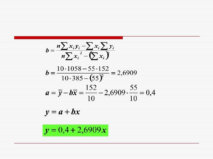 Contoh No. xi yi xi 2 1 1 4 4 1 2 2 6 12 4 3 3 8 24 9 4 4 10 40 16 5 5 14 70 25 6 6 16 96 36 7 7 20 140 49 8 8 22 176 64 9 9 24 216 81 10 10 28 280 100 ∑ 55 152 1058 385