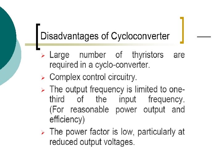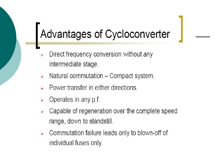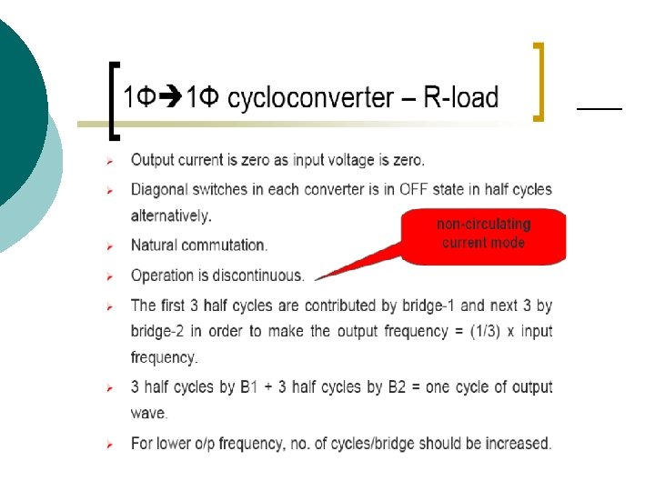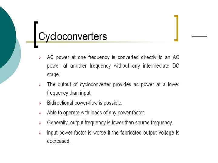 Phase-Controlled Cycloconverters (cont’d) ¡ ¡ ¡ Advantages of circulating current mode of operation, over blocking mode include: Output phase voltage wave has lower harmonic content than in blocking mode. Output frequency range is higher. Control is simple. Disadvantages Bulky IGR increases cost and losses. Circulating current increases losses in thyristors. Over-design increases cost.